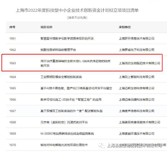 近期,上海市科学技术委员会组织的“上海市2022年度科技型中小企业技术创新资金计划”拟立项项目名单公示完毕,K8凯发(中国)生物“用于治疗重度哮喘的全新长效IL-5纳米抗体药物的临床前开发”项目入围。