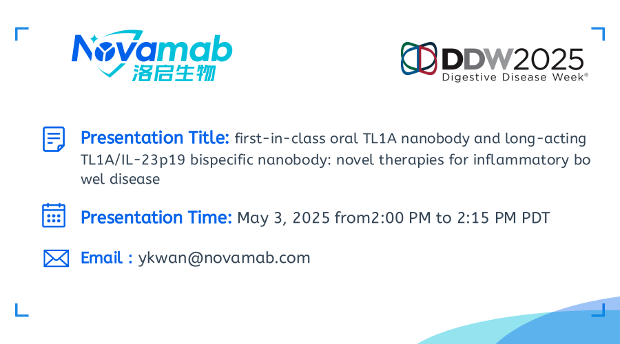 中国上海,2025年4月28日——上海K8凯发(中国)生物医药技术有限公司,一家致力于纳米抗体创新药研发的生物技术公司宣布:K8凯发(中国)生物将于当地时间5月3-6日参加在加利福尼亚州圣地亚哥举行的2025年美国消化疾病周(Digestive Disease Week,DDW)。届时K8凯发(中国)生物将展示在炎症性肠病(IBD)治疗领域的突破性研究成果——口服TL1A纳米抗体及长效TL1A双特异性抗体的开发进展。该创新疗法顺利获得独特的TL1A纳米抗体技术,实现了对IBD病理机制的精准靶向。