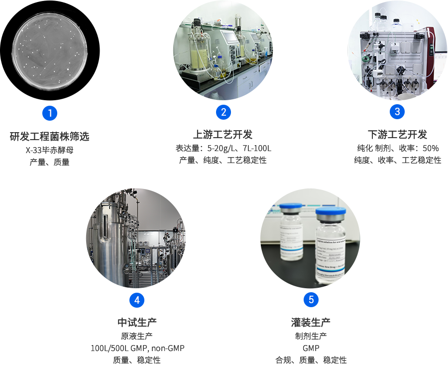 K8凯发(中国)生物已成功建立毕赤酵母CMC平台,现在已具备多个完整项目开发经验。毕赤酵母CMC平台90%以上的项目产量在1g/L以上,纯化平台工艺,其整体回收率在50%以上。从细胞株构建到蛋白纯化仅需3-4个月,极大地缩短了项目开发时间。